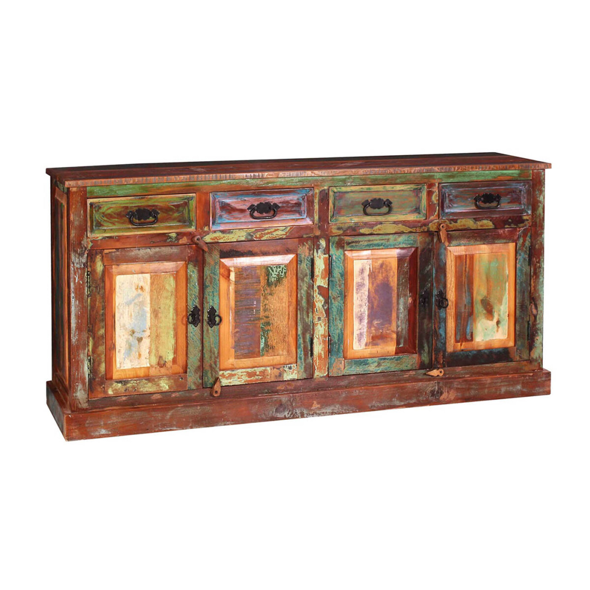 Diese massive Vollholztruhe beeindruckt durch das bunt lackierte Altholz. Das charismatische Möbelstück, mit seiner außergewöhnlichen Optik, ist ein Highlight in jedem Wohnbereich. Für die Reinigung nutzen Sie ein leicht feuchtes, fusselfreies Baumwolltuch.